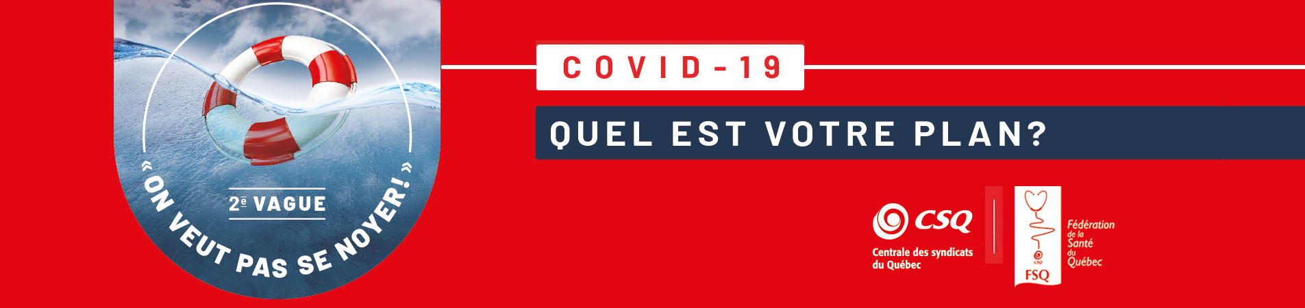 - Gouvernement du Québec/Ministère de la Santé et des Services sociaux (30 septembre 2020) | 2e vague : On veut pas se noyer » | La CSQ et la FSQ-CSQ revendiquent des plans de sauvetage pour soutenir le personnel de la santé